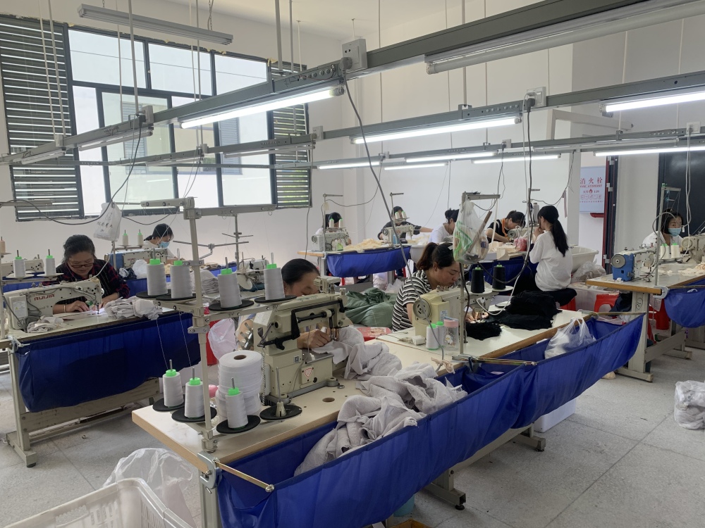 新建的厂房车间里,一排排布料在工位间流动,工人们认真地缝纫、裁剪、压边,制作出最新款的女士服装。
