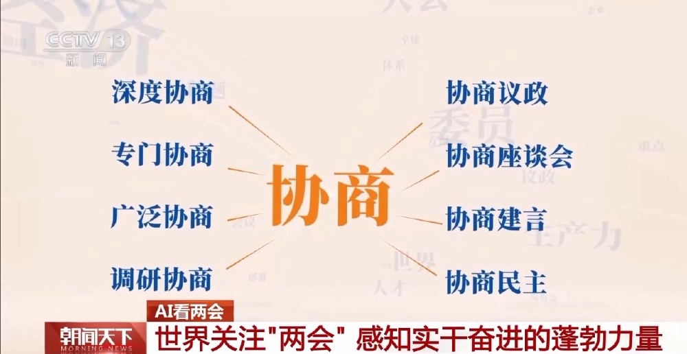 AI进一步对全场问答文本进行深度分析,发现所有名词都直接或间接地围绕一个核心词汇——“协商”。“深度协商”“专门协商”“协商议政”等表述频繁出现,充分体现了协商民主的广泛和多层次。